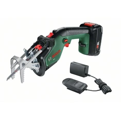 Sierra de jardín con batería; Keo; Tensión de la batería: 18 V; Capacidad de corte (con estribo de sujeción A-Grip): máx. Ø 60 mm; Capacidad de corte (sin estribo de sujeción A-Grip): máx. Ø 80 mm. Corte de ramas y setos sencillo y potente. 18V POWER FOR ALL: una batería para todo un sistema de herramientas para casa y jardín. Corta sin esfuerzos ramas de hasta 80 mm con la cuchilla de precisión suiza. El estribo de sujeción desmontable «A Grip» sujeta la rama para facilitar el trabajo con una sola mano. Las cuchillas intercambiables permiten usar una sola herramienta para una amplia gama de tareas en el hogar y el jardín. Potente batería de 18 V para realizar hasta 115 cortes por carga. Acción de corte de inicio lento, para aumentar el control y la comodidad. La Syneon Technology regula el uso de energía para optimizar la eficiencia y prolongar el tiempo de funcionamiento.