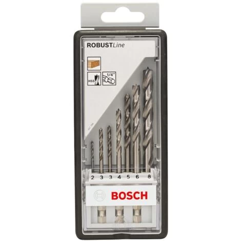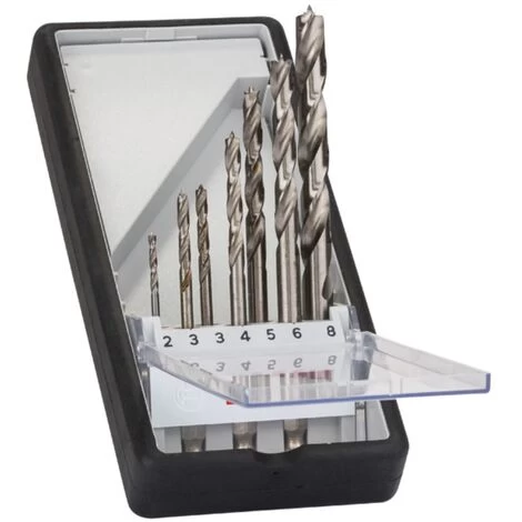 Holzspiralbohrer-Set Robust Line. 1/4 Zoll-Sechskantschaft. 7-teilig. Durchmesser: 2 / 3 / 3 / 4 / 5 / 6 / 8 mm. Arbeitslänge: 24 / 33 / 33 / 43 / 52 / 63 / 75 mm. Setgröße: 156.5 x 107 x 23 mm. Geeignet für Hart- und Weichholz. Aus dem Vollen geschliffener HSS-Präzisionsholzspiralbohrer mit Zentrierspitze und Schulterschneidern. Mit Sechskantschaft nach ISO 1173 E6.3. Schneller. werkzeugloser Bohrerwechsel. Bohrerfarbe: blank. Zweispiralig.