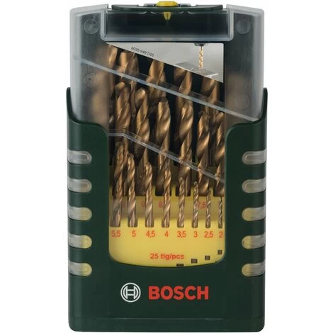 - 25 Spiralbohrer aus Hochleistungsschnellstahl mit Titan-Nitrid-Beschichtung für präzise Bohrungen in Eisen, Stahl, Nichteisenmetallen, Grauguss und Hartkunststoffen. Nicht in Aluminium verwenden.