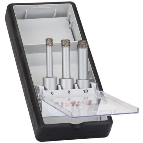 Diamanttrockenbohrer-Set Robust Line Easy Dry. Best for Ceramic. Leichtes Bohren ohne Wasser in Keramik. Für herausragende Bohrergebnisse. Die Diamantbohrer Easy Dry machen Trockenbohren in Keramik einfach. Der integrierte Kühlmittelspeicher ermöglicht gleichmäßige Leistung und der robust und verschleißfest vakuumgelötete Diamantbesatz erleichtert die Arbeit. Auch ermöglicht die Arbeitstiefe von 33 mm das komfortable Bohren von Fliesen jeder Stärke. Dieses Produkt eignet sich für eine Vielzahl von Materialien – von weichen Wandfliesen bis zu harten Bodenfliesen und feinem Steingut. Es ist für alle Akkubohrschrauber geeignet und besitzt ein Spannfutter der Größe 13 mm. Ein robustes und kompaktes Set in einer transparenten Aufbewahrungsbox. die sowohl guten Überblick als auch sichere Lagerung und Transport ermöglicht. Hinweis: Bohren ohne Schlag. Optimale Drehzahl 1500 U/min.