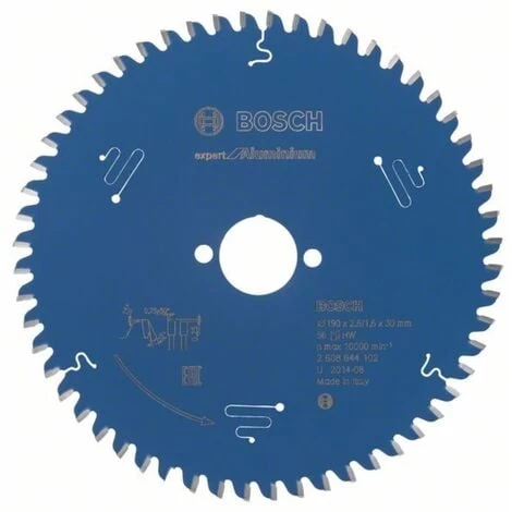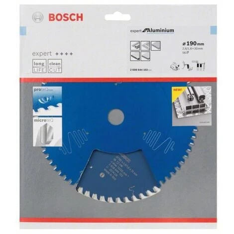 Kreissägeblatt Expert for Aluminium für Tauch- und Handkreissägen. Außendurchmesser: 190 mm. Bohrung: 30 mm. Schnittbreite: 2.6 mm. Stammblattstärke: 1.6 mm. Zähnezahl: 56. Für saubere Schnitte in Nichteisenmetalle wie Aluminium. Auch geeignet zum Schneiden von Kunststoffen und Epoxy. rohen Spanplatten. Akustikplatten. Leichtbauplatten. abrasive ein- oder zweiseitig beschichtete Plattenwerkstoffe sowie Faserwerkstoffe wie MDF- und OSB-Platten. Zähne aus Microteq für hohe Lebensdauer. Die Verwendung des Universalschneidöls 2 607 001 409 erhöht die Standzeit bei Schnitten in Metall. z. B. Aluminium. um ein Mehrfaches.