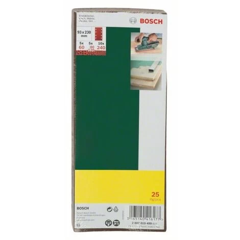 Schleifblatt-Set für Schwingschleifer. 25-teilig. 8 Löcher. Gespannt. Blattabmessung. Breite: 93 mm. Länge: 230 mm. 5 Stück Körnung 60. 5 Stück Körnung 80. 5 Stück Körnung 120. 10 Stück Körnung 240. Langlebige Schleifblätter mit leichter Abtragsleistung für gleichmäßige Schleifergebnisse auf größeren. ebenen Oberflächen. Zum perfekten Vorbereiten von Oberflächen für die Weiterverarbeitung. Planschleifen und Verschleifen von kleinen Unebenheiten auf Hart- und Weichholz. Holzwerkstoffen. Spanplatten und Metall. Ausbessern vor dem Farb- oder Lackauftrag. Leistungsstarke. passgenaue Schleifblätter im Format 93 x 230 mm zur Spannbügelbefestigung. 8 Absauglöcher für Staubabsaugung. Passend für Schwingschleifer gängiger Elektrowerkzeugmarken. Sicherheitshinweis: Bei Gebrauch bitte Schutzbrille. Staubschutzmaske und Gehörschutz tragen.