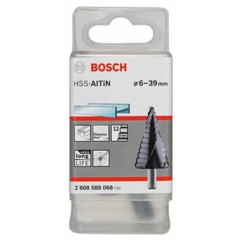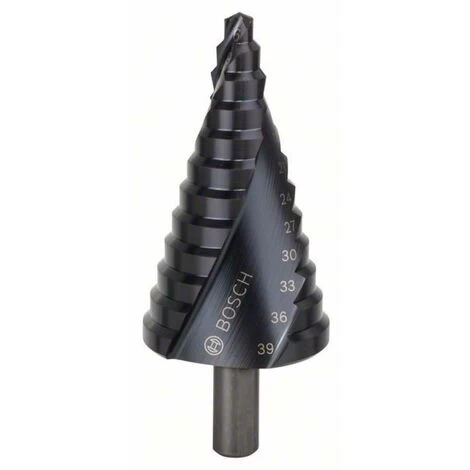 Bosch Stufenbohrer HSS-AlTiN, 6 – 39 mm, 10 mm, 93,5, 12 Stufen | Eigenschaften: Werkstoff: HSS, Oberfläche: AiTIN, Ausführung: HSS-AlTiN, Durchmesser: 6-39, Gesamtlänge: 93,5, Schaftdurchmesser: 10, Schaft: Zylinderschaft, Spezifikation: 6 – 39 mm, 10,0 mm, 93,5 mm, Stufendurchmesser: 6-39, Stufenlänge: 4, Schneidstoff : HSS, Gesamtlänge mm: 93,5, Schaftdurchmesser mm: 10,0, Stufendurchmesser (Bereich) mm: 6-39, Stufenhöhe mm: 4, Mit Kühlkanal: Nein, Min. Bohrbereich: 6, Max. Bohrbereich: 39