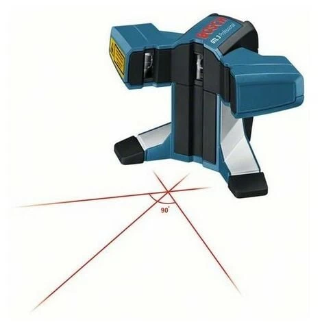 - Projiziert zwei senkrechte Laserlinien sowie eine dritte 45°-Linie für eine präzise und schnelle Ausrichtung von Fliesen auf dem Boden oder an der Wand.