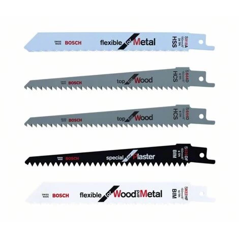Messer-Set. 5 auswechselbare Sägeblätter für verschiedene Anwendungen. 2 Stück für Holz. 1 Stück für Metall. 1 Stück für Holz und Metall. 1 Stück für Gips.